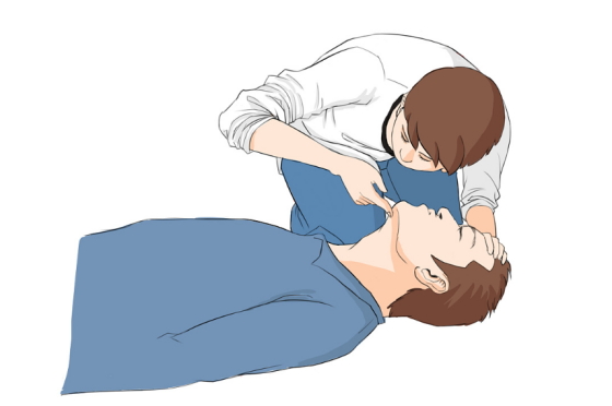 ? ? ? ?如患者無呼吸,立即進行口對口人工呼吸。摸頸動脈,如果能感覺到搏動,那么僅作人工呼吸即可。為防止細菌感染,采用接口套,用酒精消毒。施救者一手捏住患者鼻子,大口吸氣,屏住,迅速俯身,用嘴包住患者的嘴,快速將氣體吹入。與此同時,施救者的眼睛需觀察患者的胸廓是否因氣體的灌入而擴張,氣吹完后,松開捏著鼻子的手,讓氣體呼出,這樣就是完成了一次呼吸過程。每分鐘平均完成12次人工呼吸。