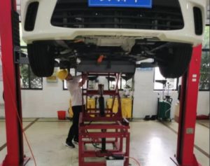 舉升車(chē)輛車(chē)身離地至1.7米左右(根據(jù)身高適合拆卸動(dòng)力電池高度),落鎖并再次確定支撐平穩(wěn)